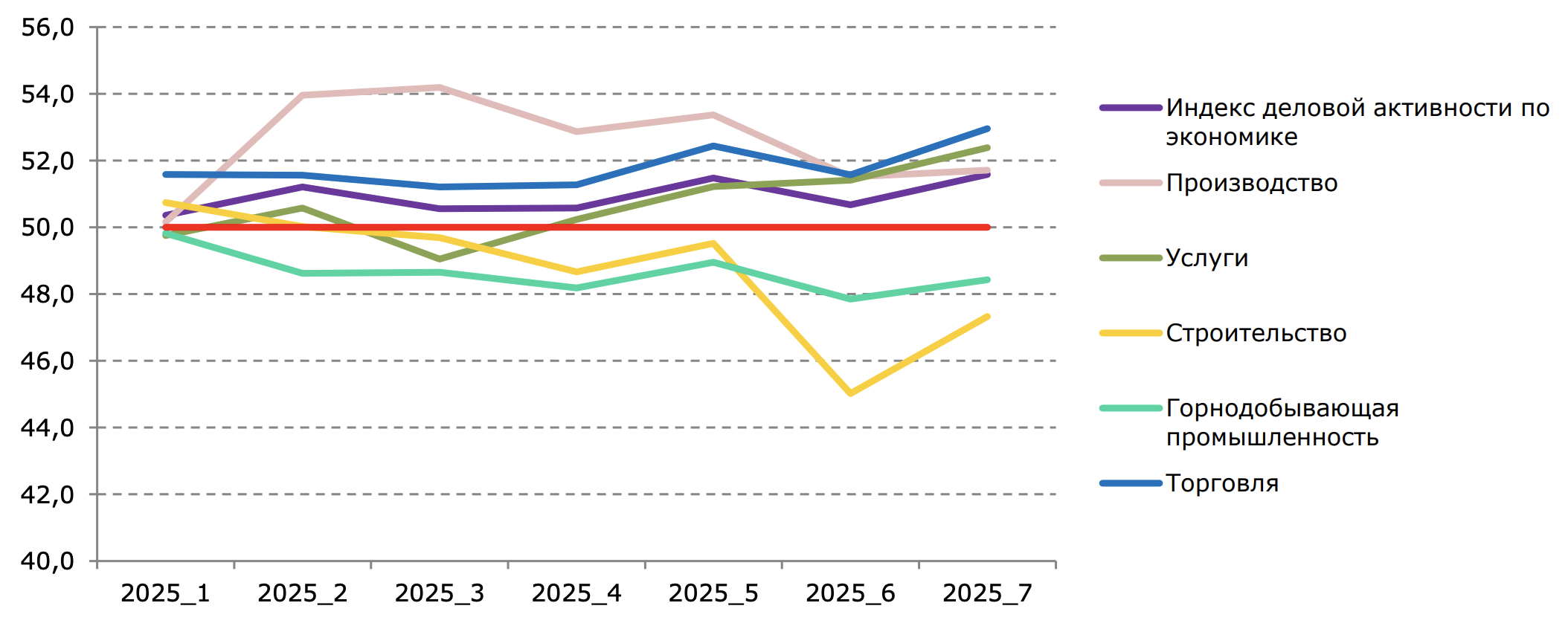 Согласно результатам опроса, проведённого Национальным Банком, в июле 2025 года в Казахстане наблюдался рост деловой активности, что подтверждается увеличением индекса деловой активности (ИДА) до 51,6 против 50,7 в июне. Положительный вклад в улучшение внесли производство, торговля и сектор услуг, где ИДА достиг 51,7, 53 и 52,4 соответственно, продемонстрировав рост по сравнению с предыдущим месяцем (Рис.1). В производстве положительная динамика была обусловлена ростом новых заказов (спроса). В то же время горнодобывающая отрасль и строительство остаются в зоне снижения с индексами 48,4 и 47,3 соответственно (в июне – 47,8 и 45). Стоит отметить, что горнодобывающая промышленность Казахстана уже в течение последних пяти лет находится в зоне снижения, несмотря на отдельные эпизоды незначительного роста.