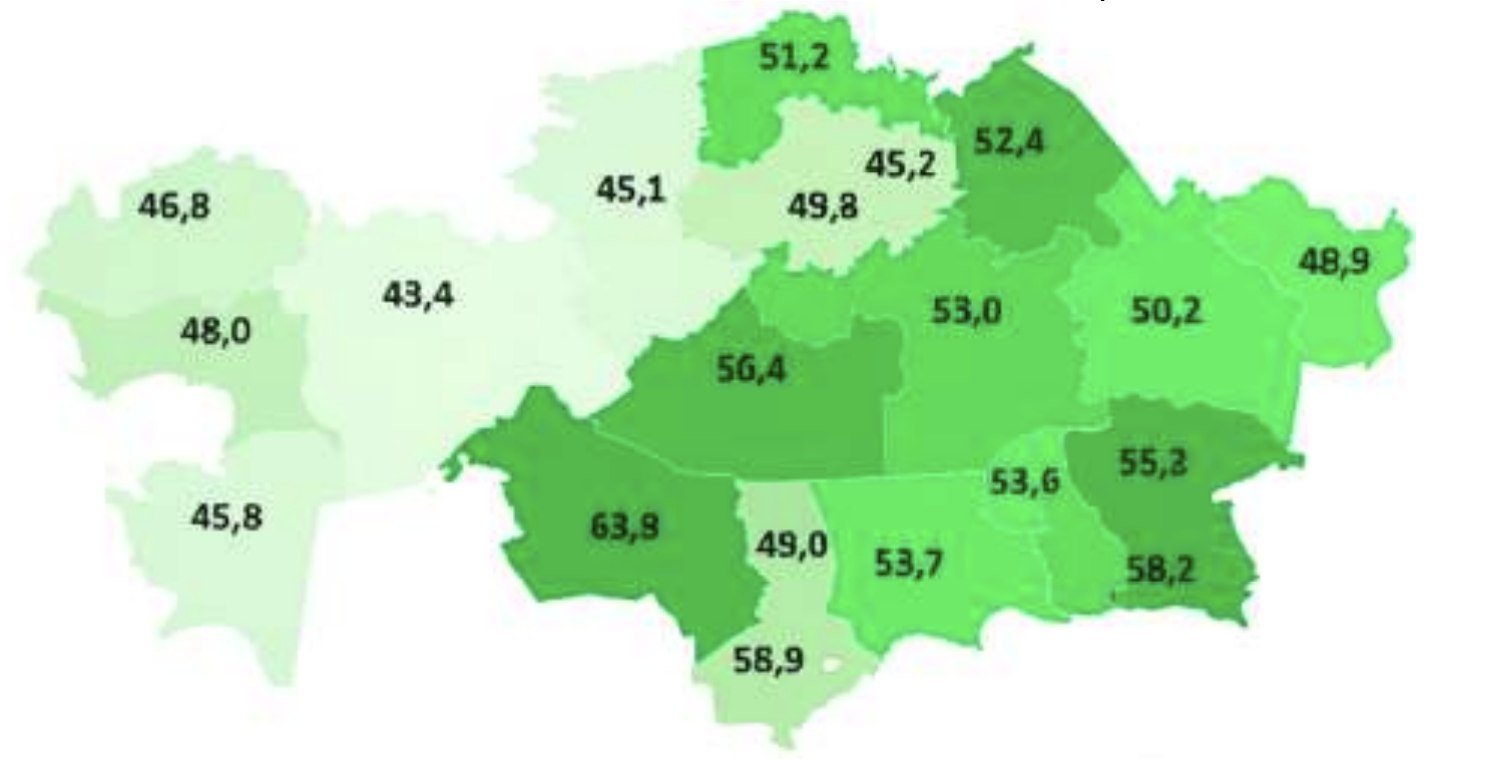 Самый высокий индекс отмечен в Кызылординской области (63,8), а самый низкий – в Актюбинской (43,4). Слабые позиции Актюбинской области, вероятно, связаны с ограниченным развитием инфраструктуры и низким уровнем экономической диверсификации в регионе.